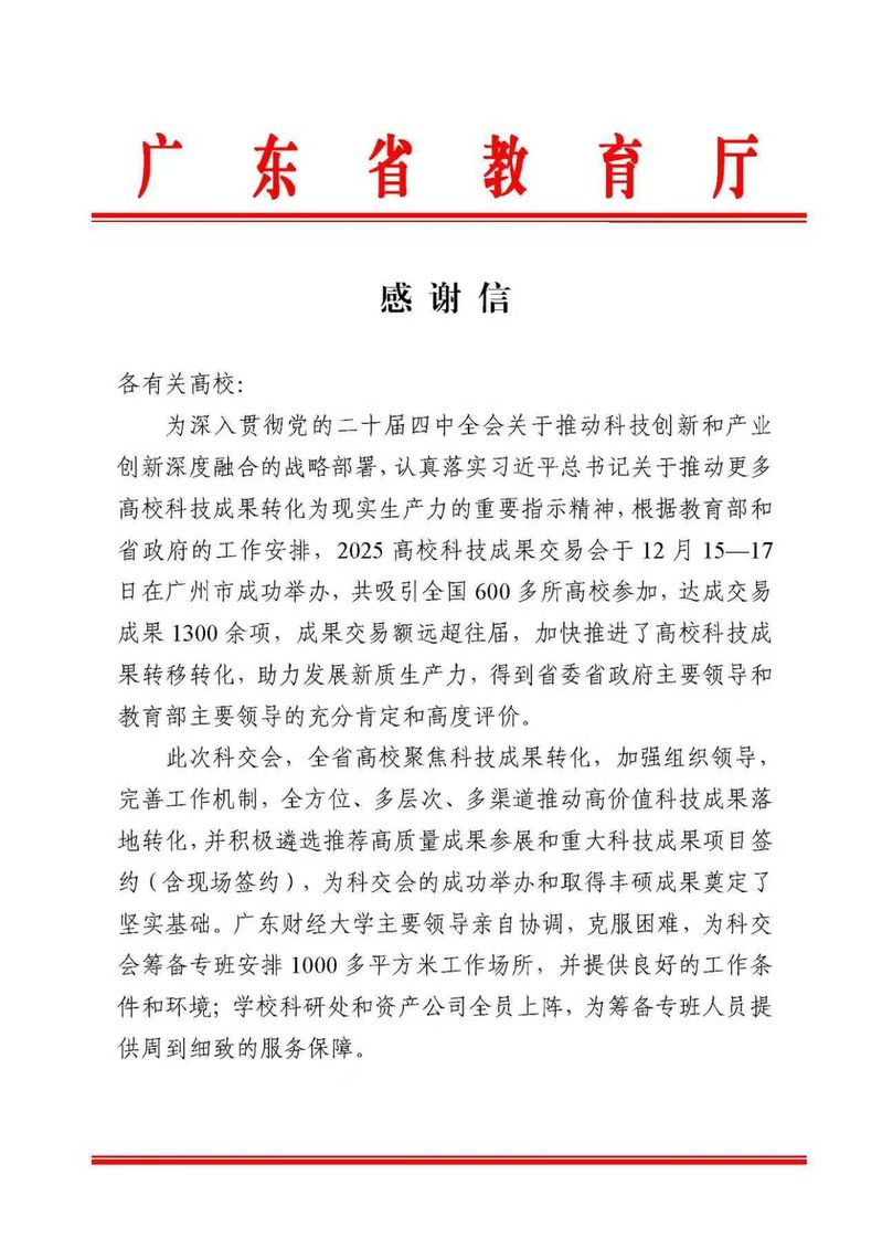 省教育厅来信感谢我校对2025高校科技成果交...